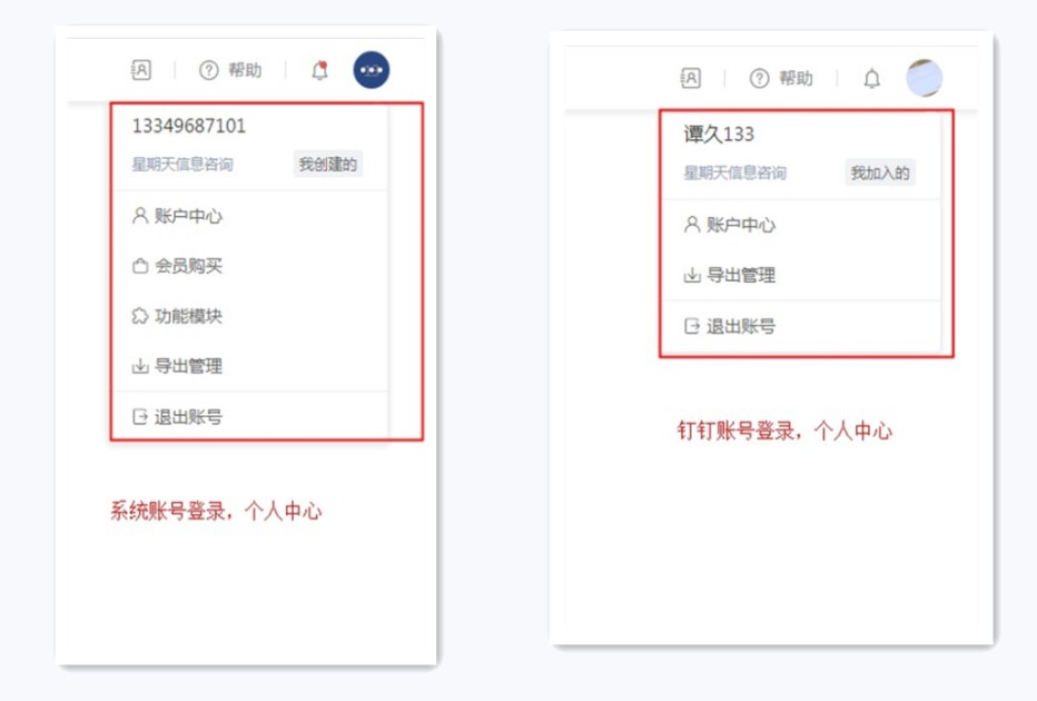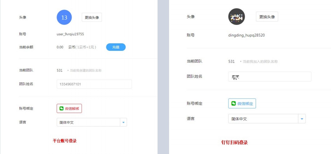 云境Support账号和钉钉扫码登录系统,在个人中心的功能不一致。