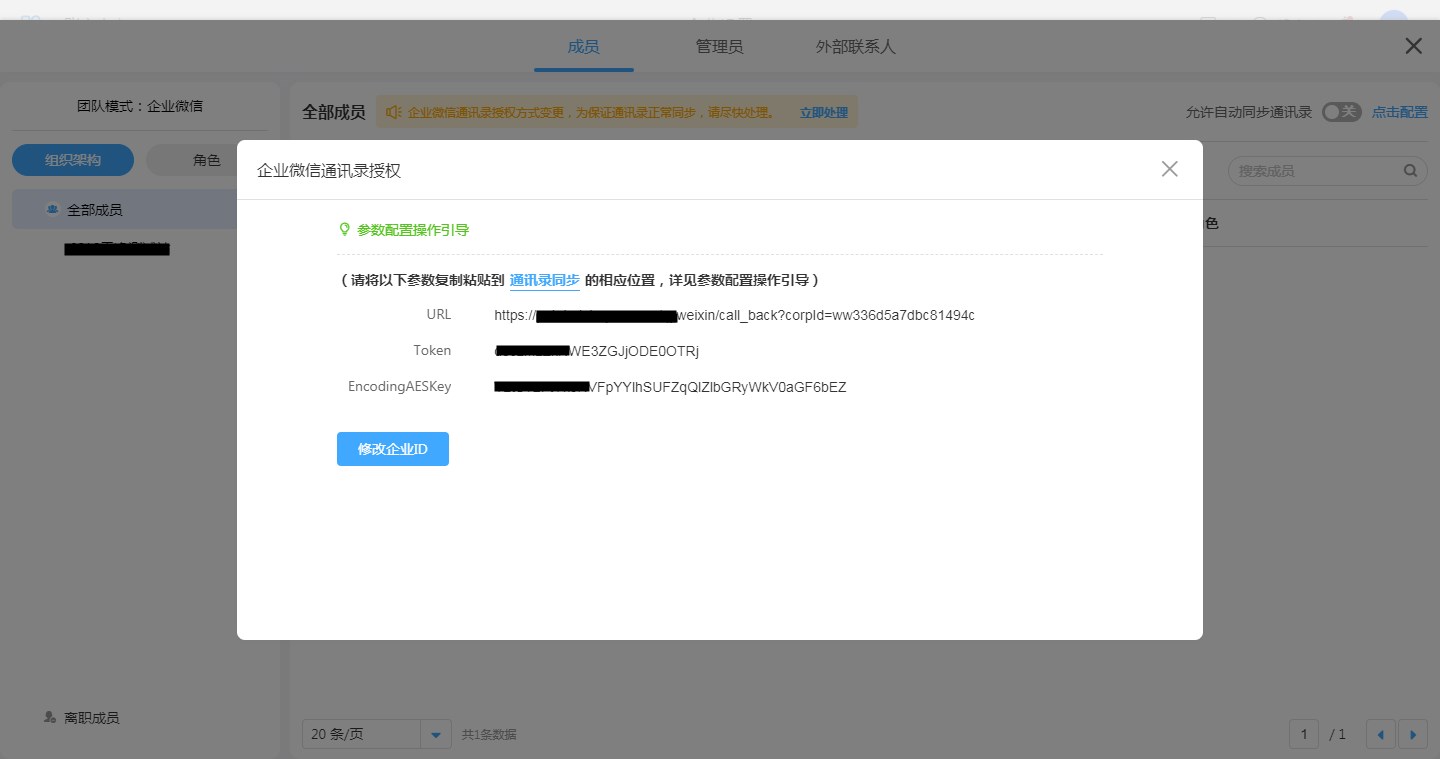 - 在企业微信后台批量将成员由不可见部门设置为可见部门时,自动同步通讯录后,可能会超过系统成员数量限制,导致系统功能无法使用,此时需手动移除多余数量的成员。