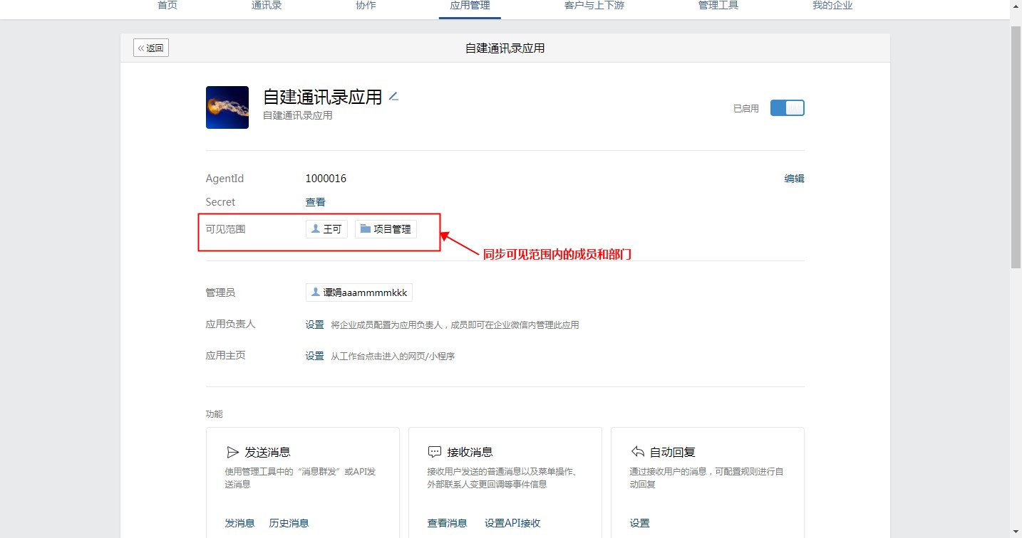在设定好可见范围内的成员之后, 进入【通讯录】 -> 【成员管理】 -> 手动同步成员即可。