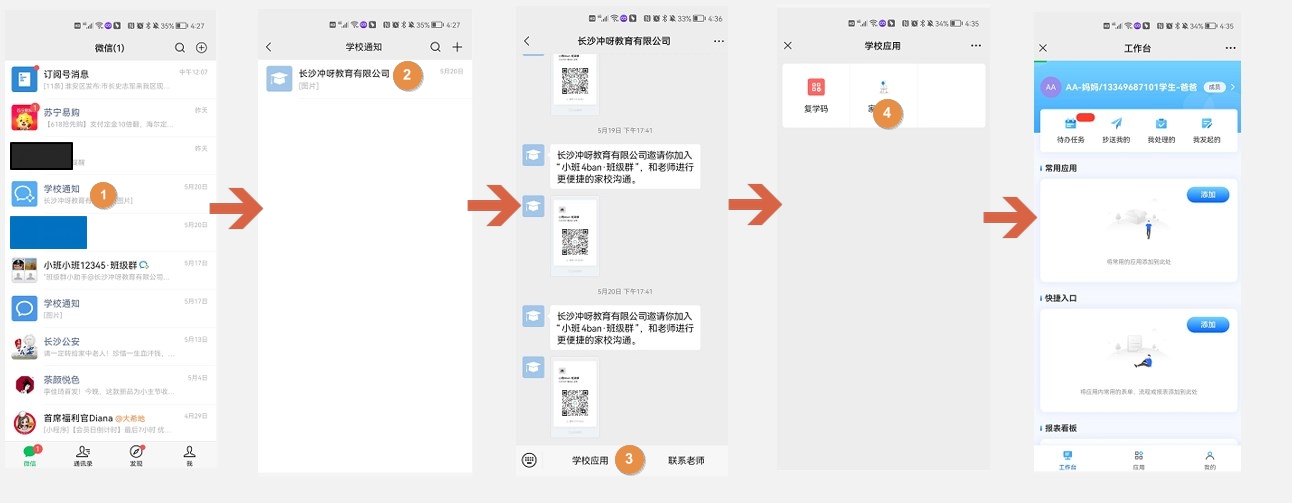 家校通讯录内的家长可在微信->[学校通知]->[学校]->[学校应用],找到对应的应用进入系统。