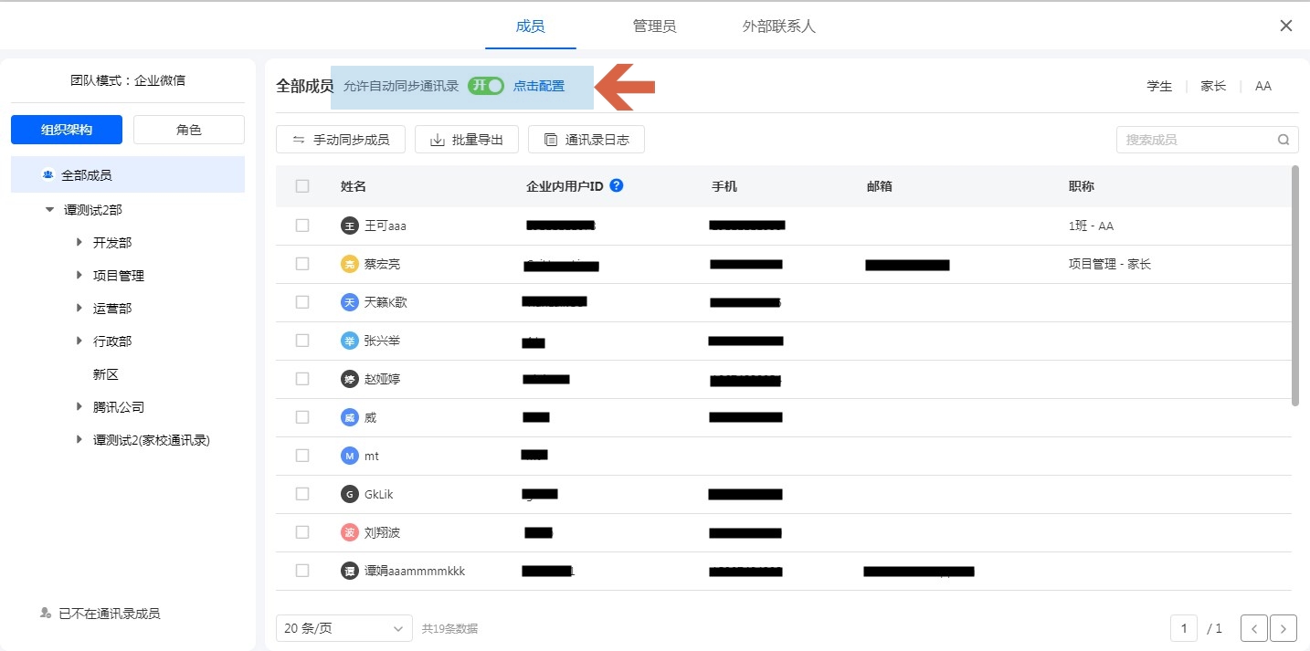 家校通讯录的手动同步和自动同步和内部通讯录同步方式一致,开启自动同步开关后,当组织架构或者成员信息变更时,会同步到系统通讯录中。