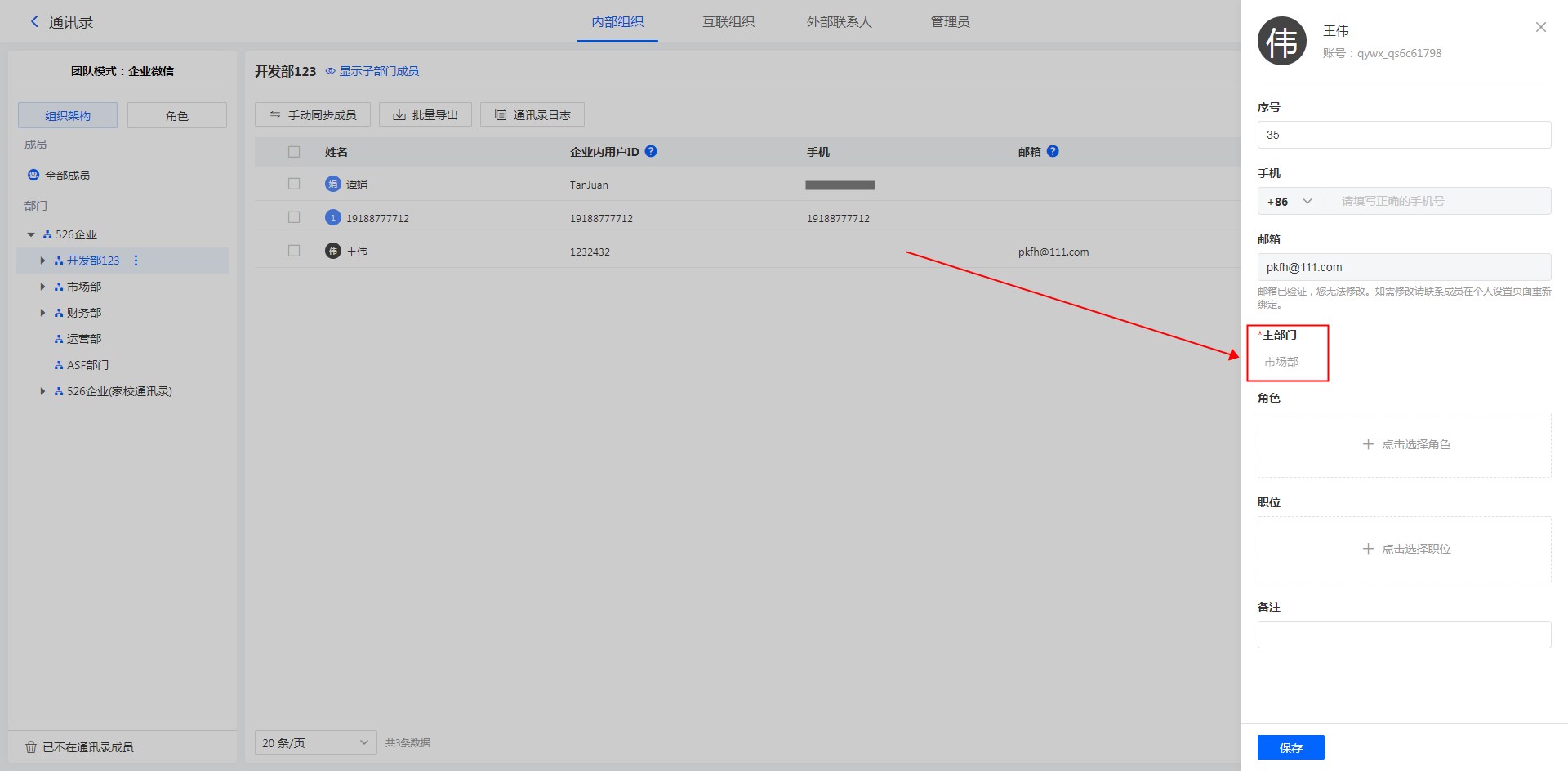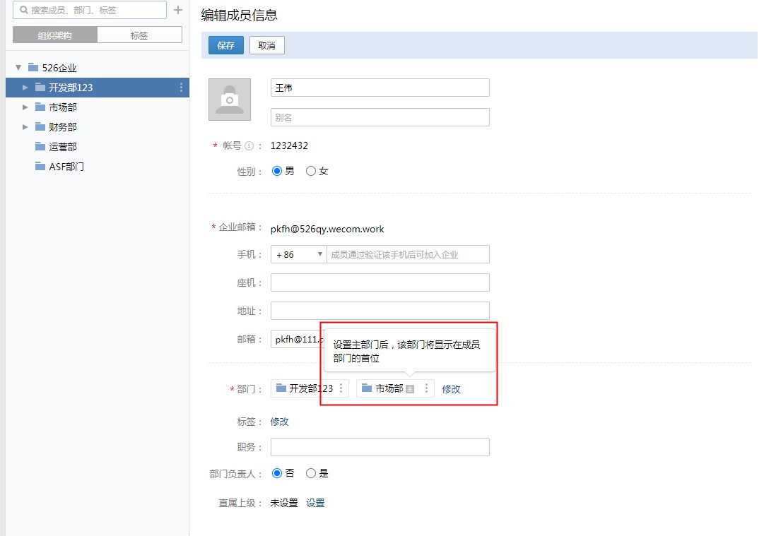| 企业微信主部门 | 同步到平台通讯录后,成员主部门信息 |