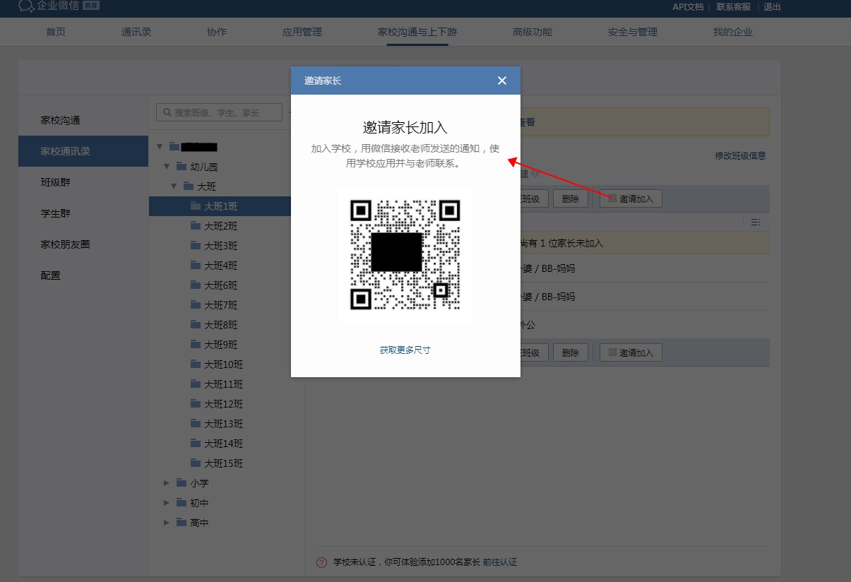 方法:企业微信管理后台->家校沟通->家校通讯录->班级->邀请加入,家长微信扫码加入。