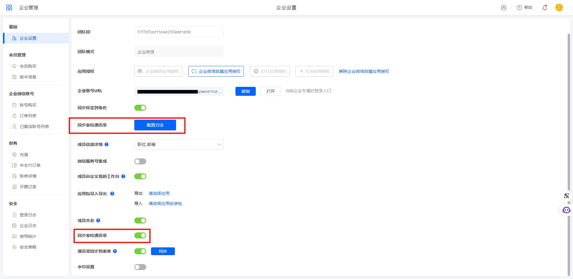 企业微信自建应用授权模式:创建者登录,进入系统[账户中心]->[企业设置]->[同步家校通讯录],根据页面指引完成配置,并开启家校通讯录同步开关。