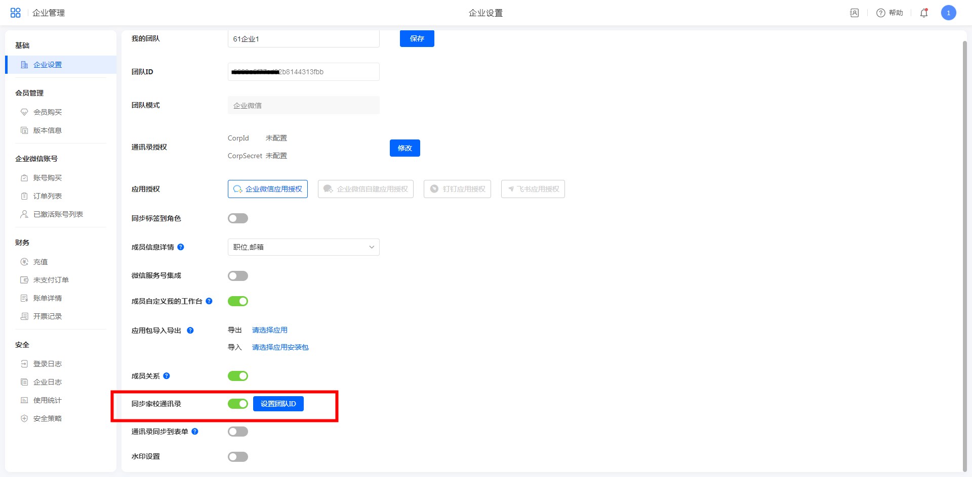 企业微信三方应用授权模式:创建者登录,进入系统[账户中心]->[企业设置]->[同步家校通讯录],直接开启开关即可。