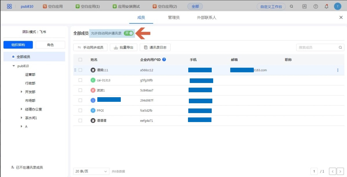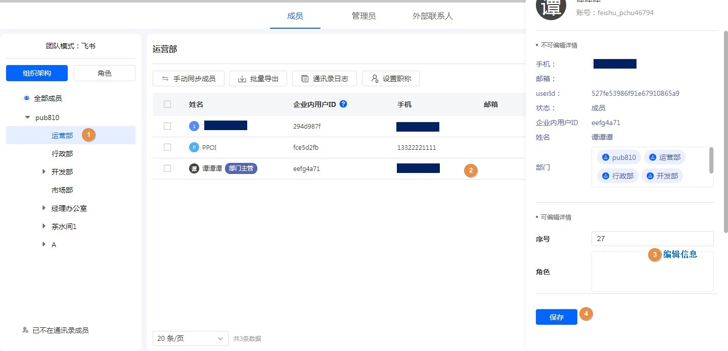 在飞书管理后台操作组织架构及成员信息时,人员同步至通讯录再同步到表单通讯录中