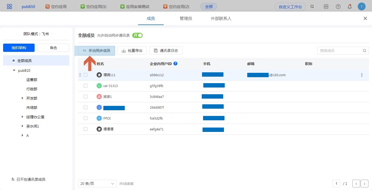 关闭自动同步功能后,在飞书通讯录中修改成员或部门信息后,点击手动同步成员按钮进行组织架构的同步操作。