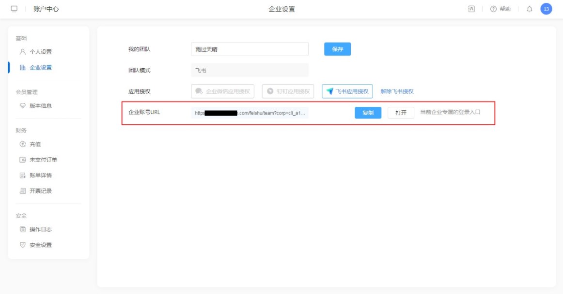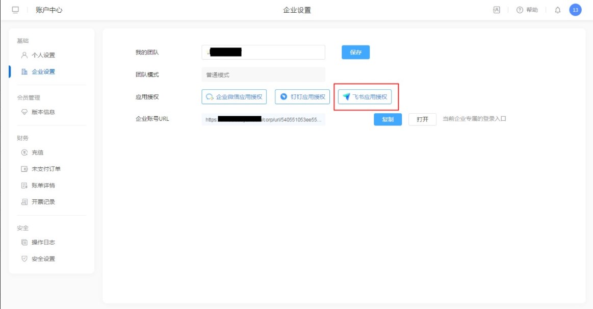 云境Support账号登录系统后,进入【右侧头像】-【账号中心】-【企业设置】,在企业设置中可以进行飞书应用授权。