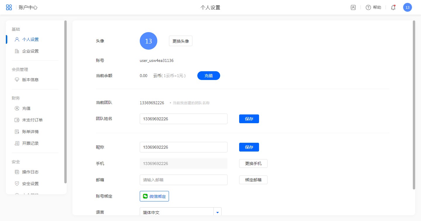 账户中心包括基础、会员管理、财务和安全。