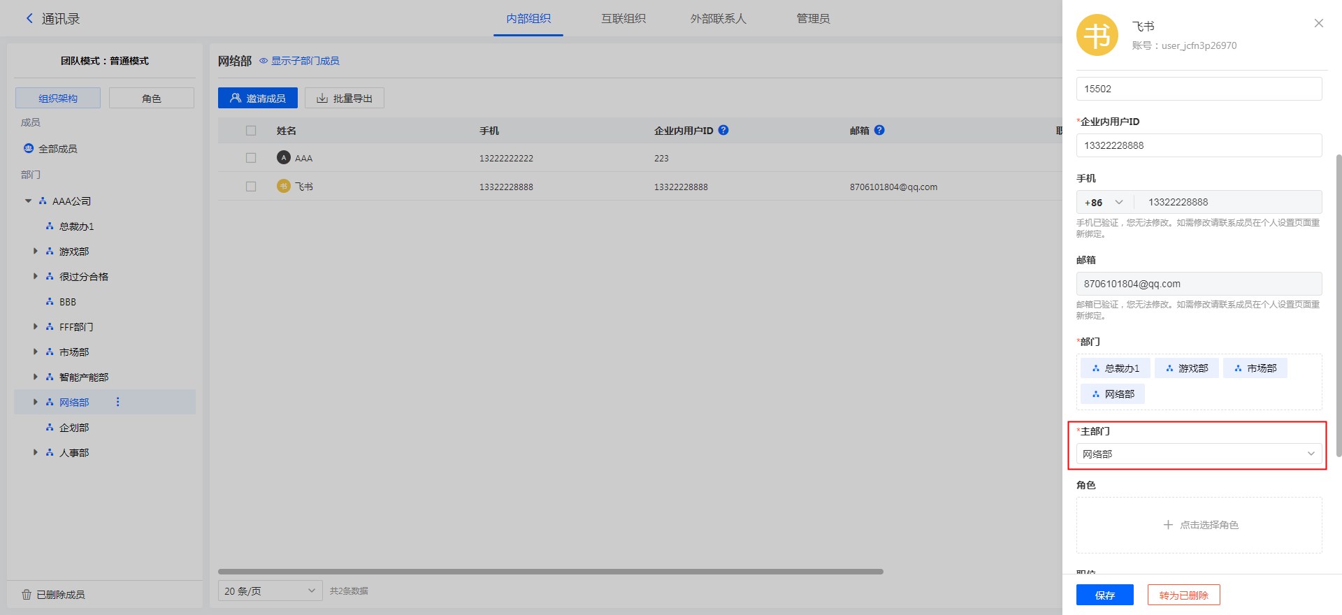 通讯录页面点击单条成员数据可以查看详情并进行姓名/企业ID/手机/邮箱/部门/角色/职位等信息的修改。
