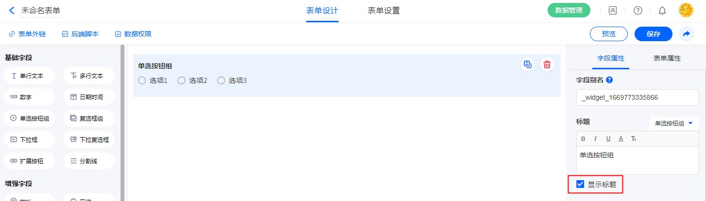 “单选按钮组”用于表单中单选的场景,在录入数据的时候直接选择选项。