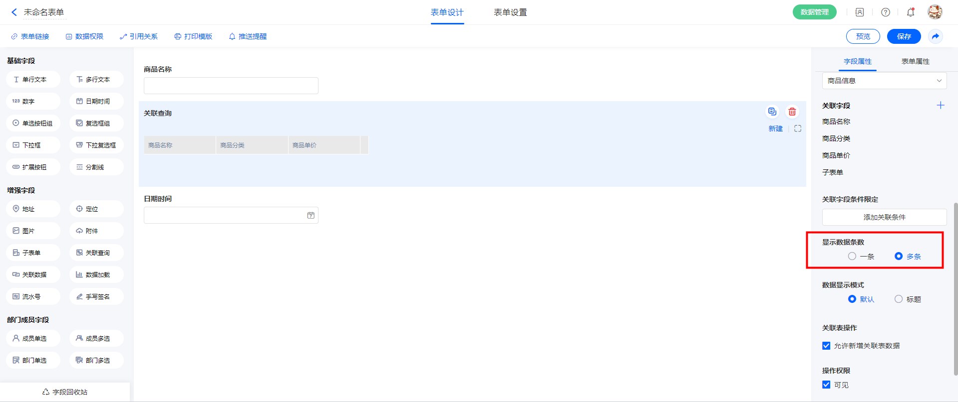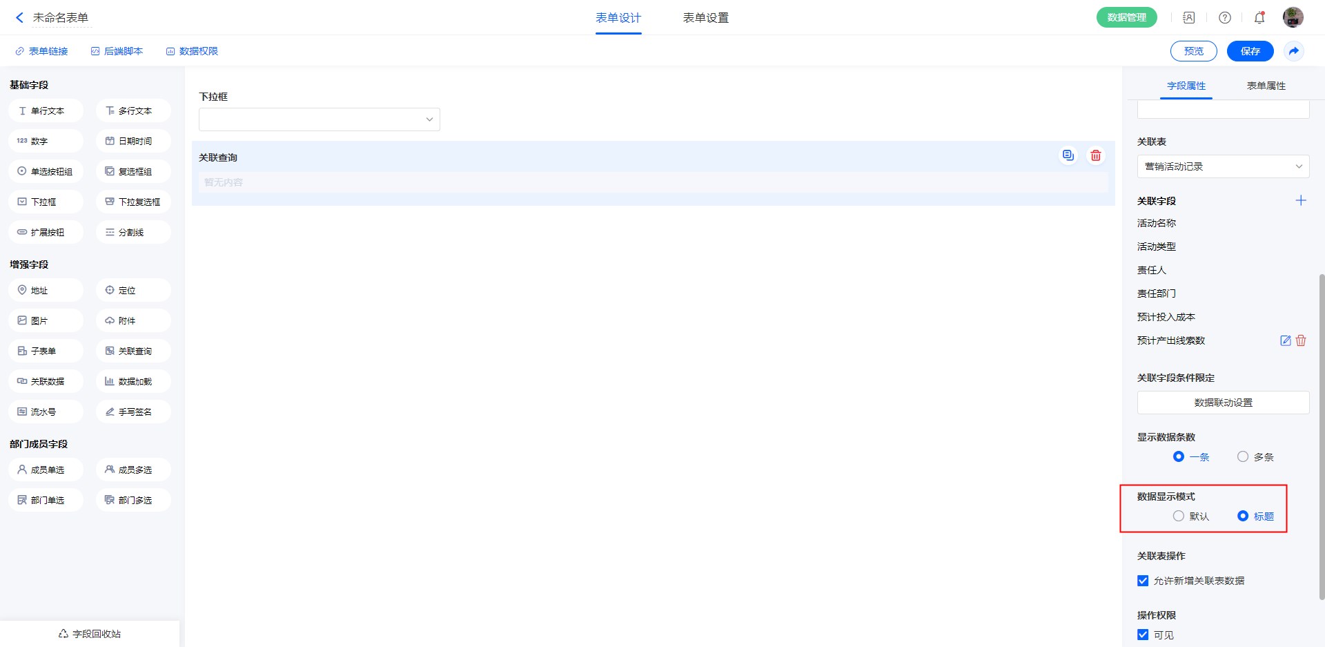 | 设置入口:表单设计—关联查询—数据显示模式 |