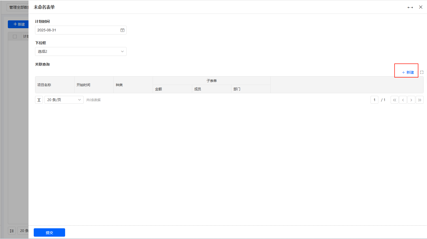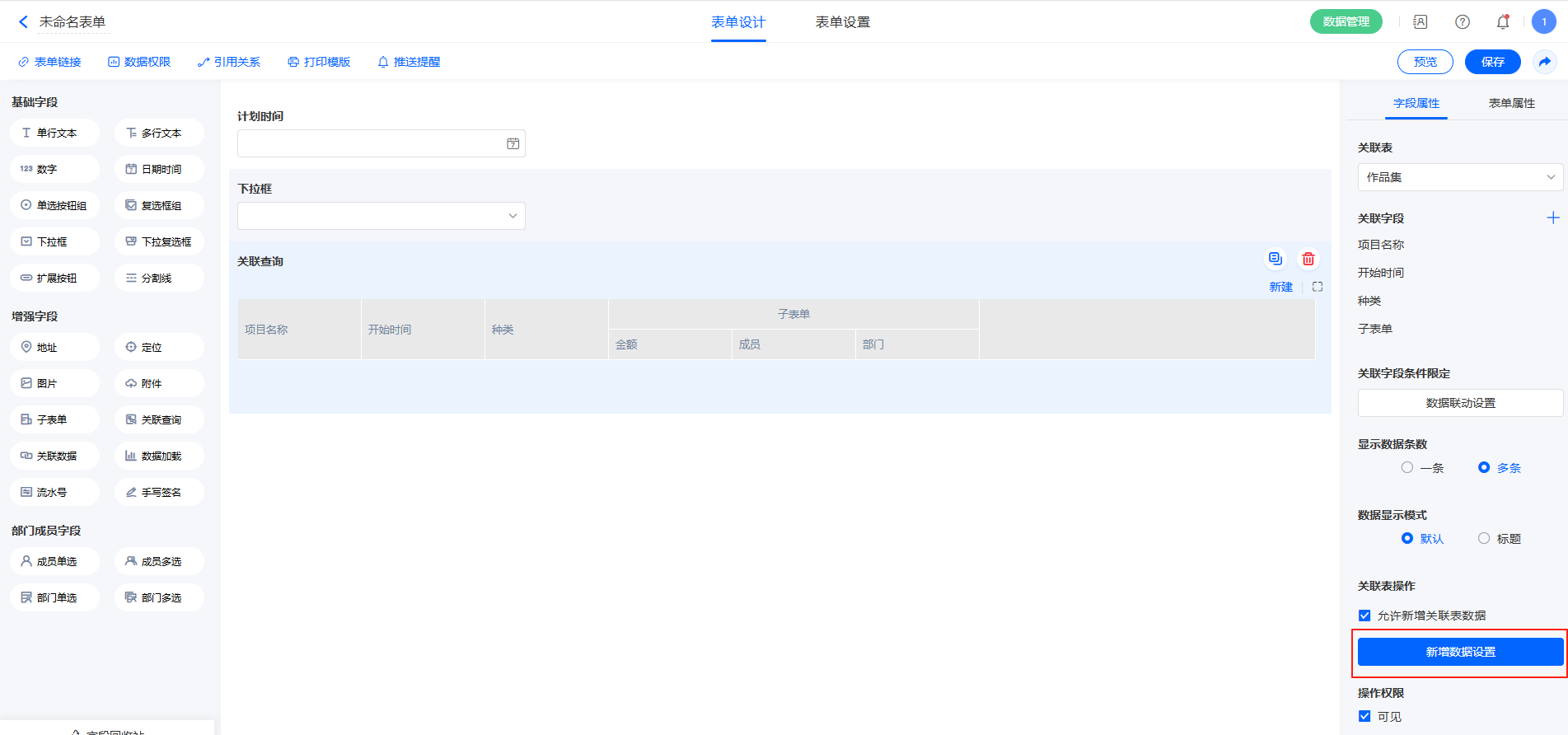 - 当关联查询为子表单字段时,仅新增数据页可展示;