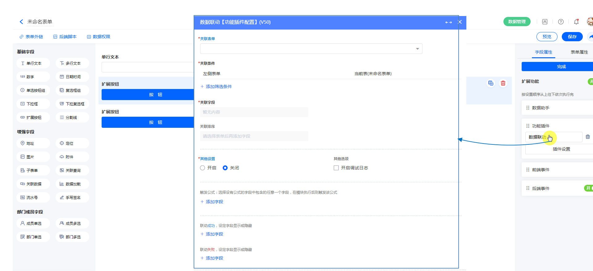 功能插件是扩展按钮基本功能之一,设置扩展按钮的属性为功能插件,并对引用的插件进行设置,在点击扩展按钮后,会按顺序执行所设定的功能插件,为表单的扩展性提供无限支持。