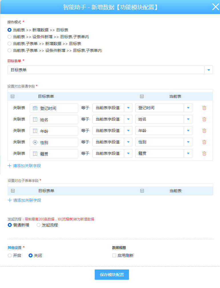 例如:当前表单填写内容,通过按钮向其他表单新增数据,插件配置如下: