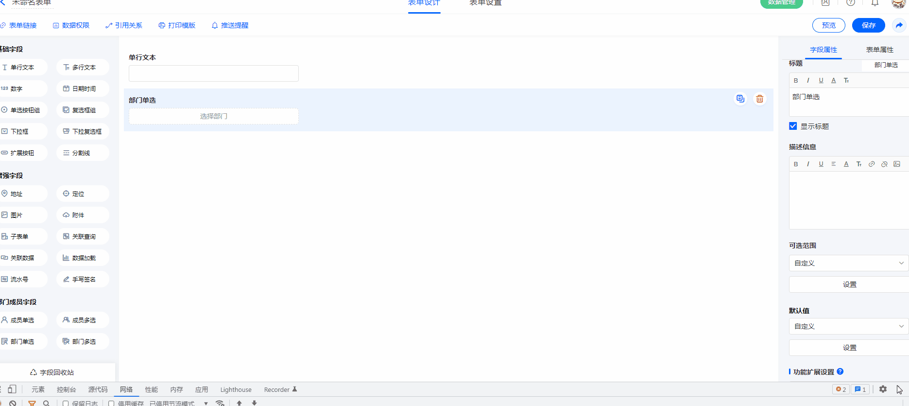 部门字段的可选范围如果设置数据联动,那么页面上不会展示默认值属性;可选范围为自定义时,页面会展示默认值属性。