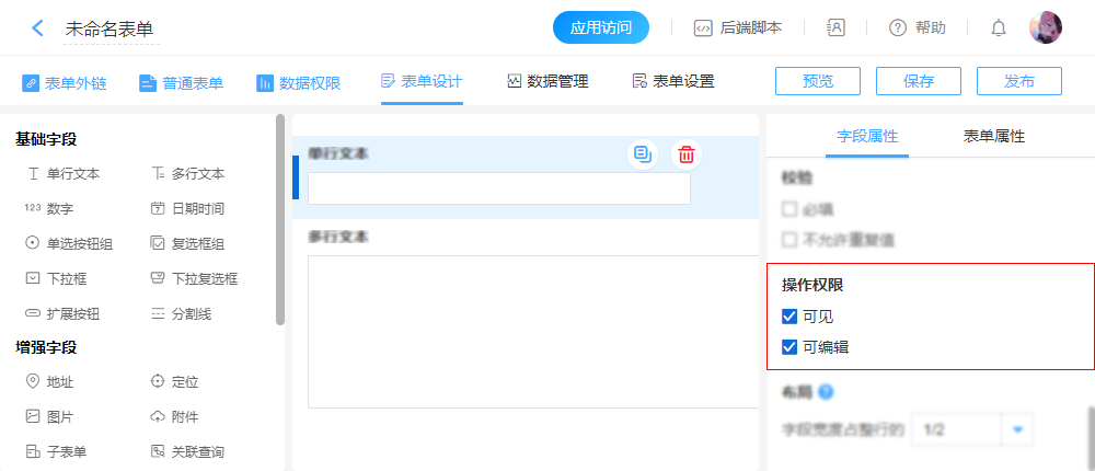 注意:表单外链不支持成员字段/部门字段,只有在系统数账号内访问表单,才可使用成员字段/部门字段。