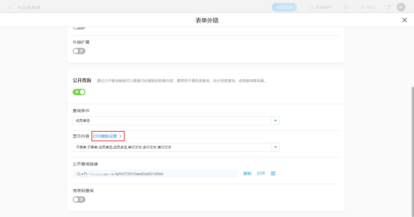• 表单外链-显示内容-打印模板设置,可以配置公开查询外链专属打印模板。