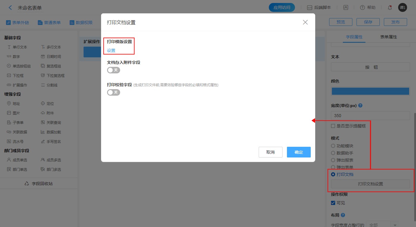 • 在表单设计页,为扩展操作配置打印模板(字段属性-模式-打印文档-打印文档设置)。