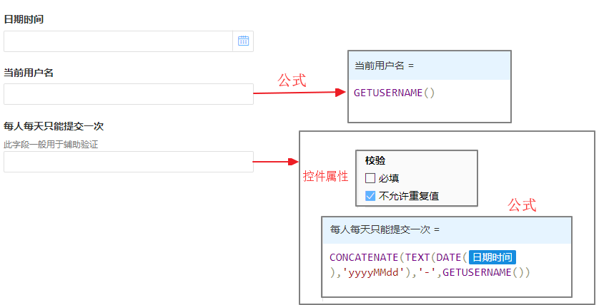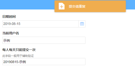 与其他字段组合,实现不允许重复提交。例如,每人每天只能填报一条数据。