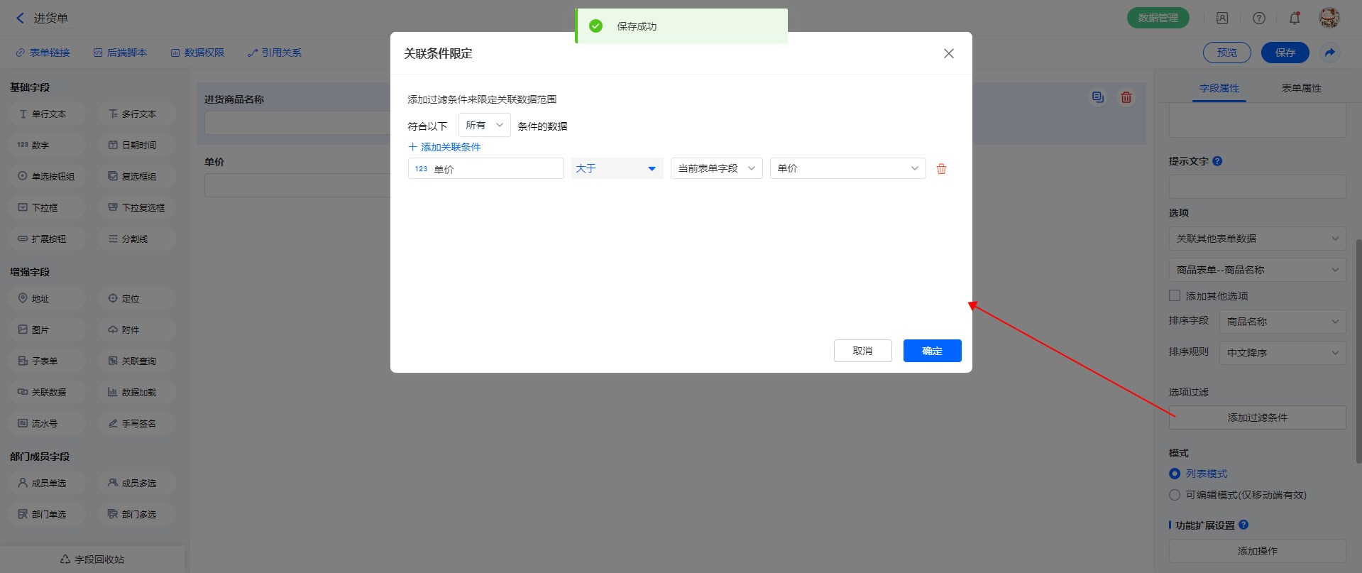 允许新增关联表数据:勾选后,支持新增关联表单的数据。