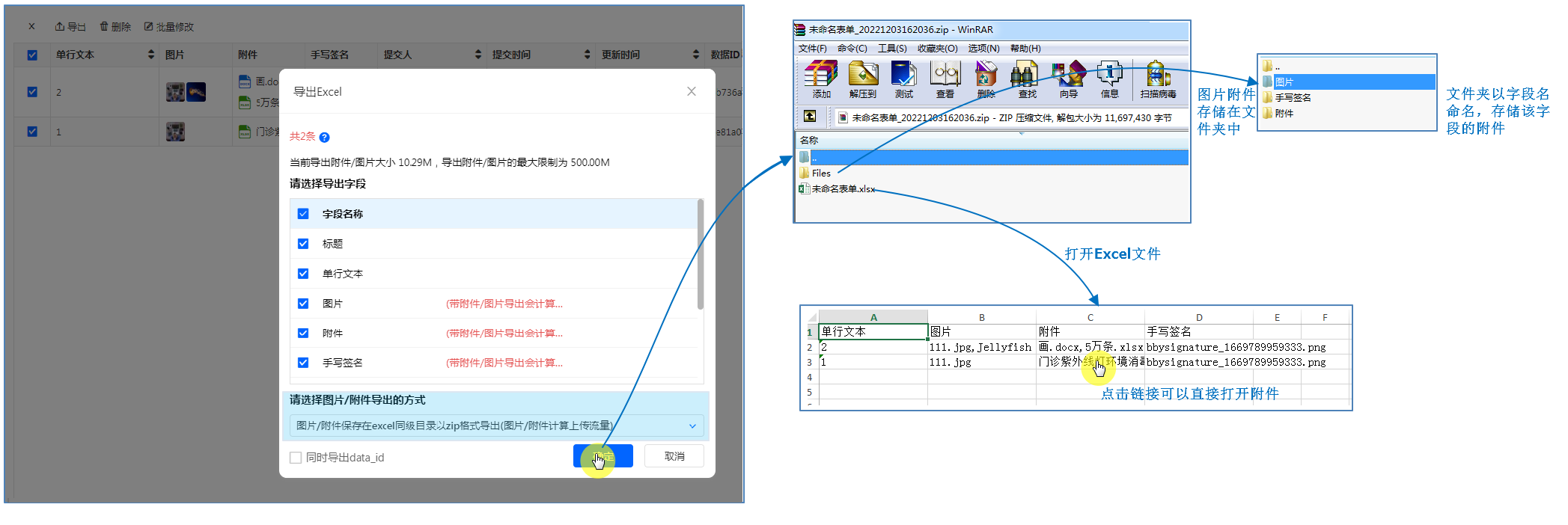 带图片/手写签名/附件导出时,导出文件为zip包,包含Excel文件和图片附件文件夹,如下所示: