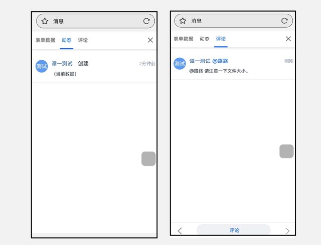 有管理数据权限的成员及管理员进入移动端界面后,选择查看数据或管理数据后,点击选择数据,就能看到『动态』区和『评论』区。