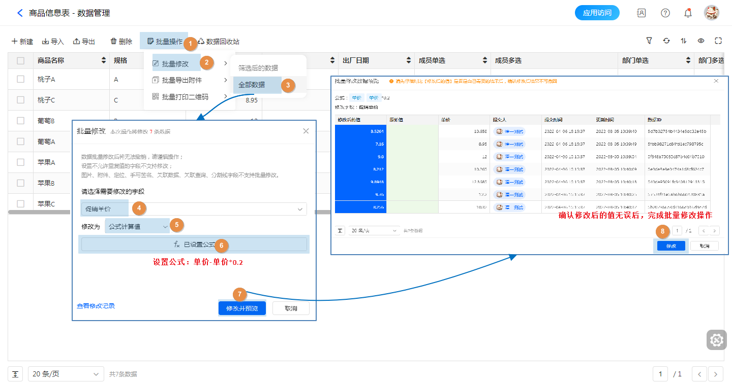 方法一:【数据管理】-【批量操作】-【批量修改】-【修改筛选后的数据】或【修改全部数据】