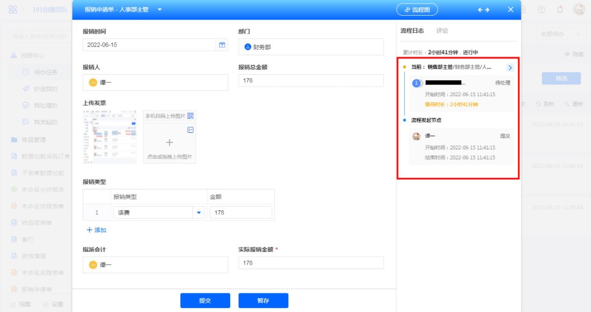 - 流程日志:,显示了各个节点负责人的处理情况,包括负责人,操作状态,开始时间,操作时间。