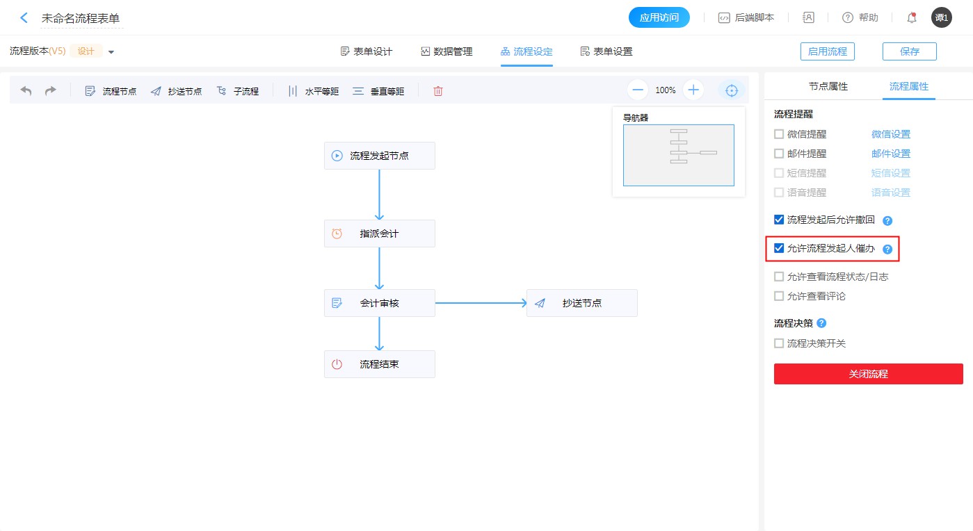 【流程表单设计】-【流程设定】-【流程属性】-【勾选[允许流程发起人催办]】