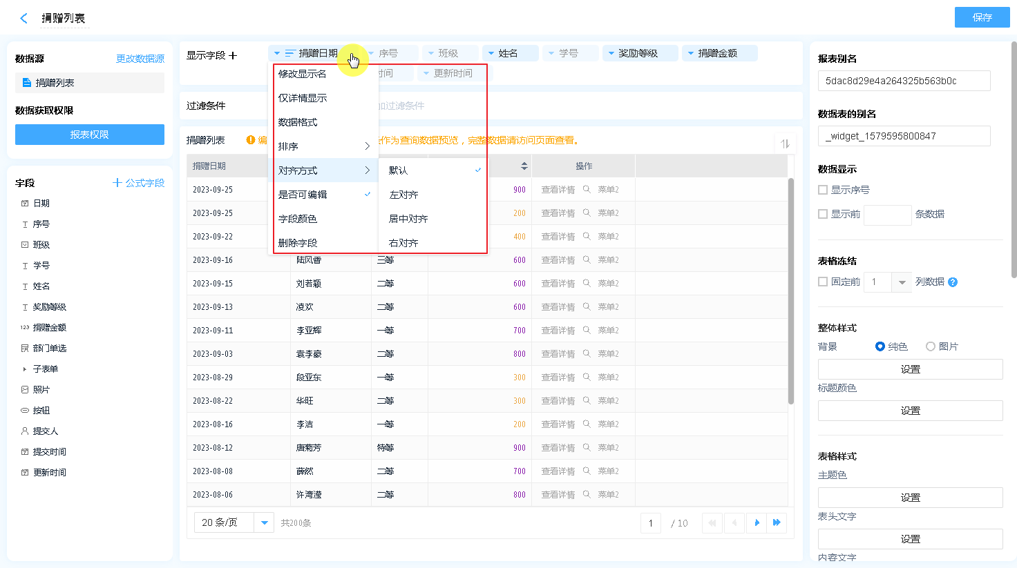 表单作为数据表的数据源,可通过设置报表权限,对源数据进行新增、编辑、修改、删除数据。 - 数据视图:可选择