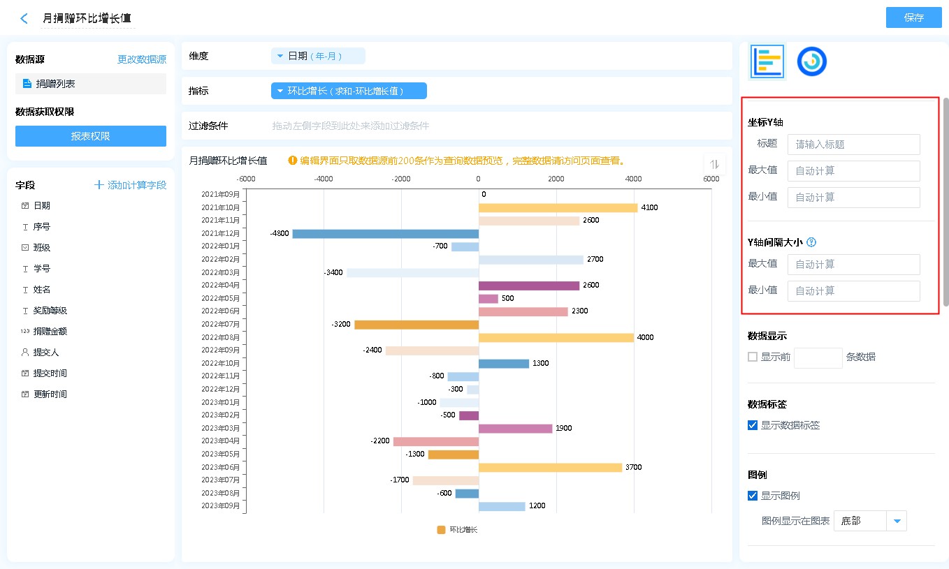 - 由于Y轴间隔太小会导致图表卡,所以限制【最大值】的下限值≈Y轴的最大刻度和最小刻度的区间大小/100,当输入的最大值小于下限值,则图表的Y轴刻度间隔按默认显示;反之,则图表Y轴刻度间隔按照设置的值显示。