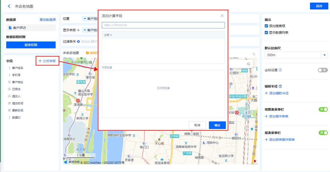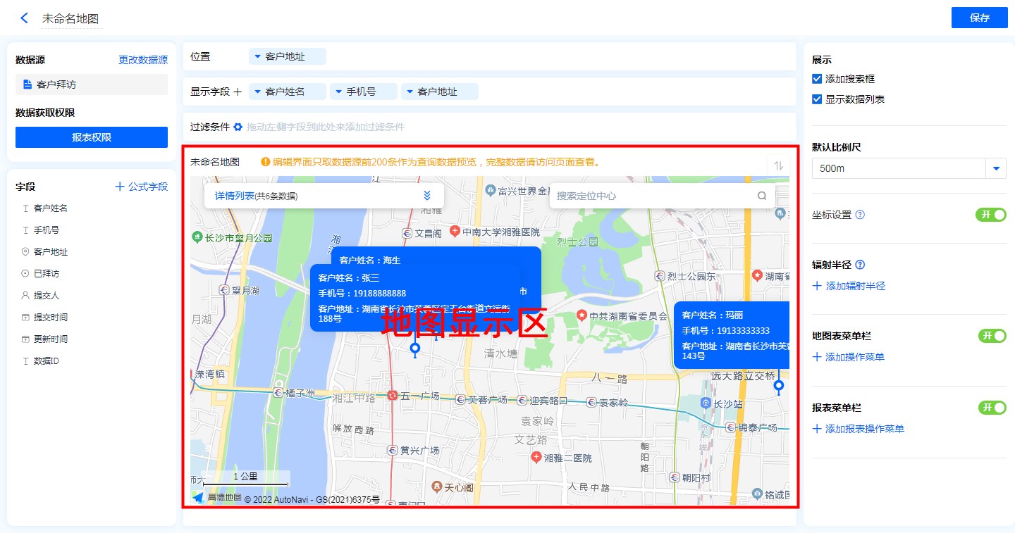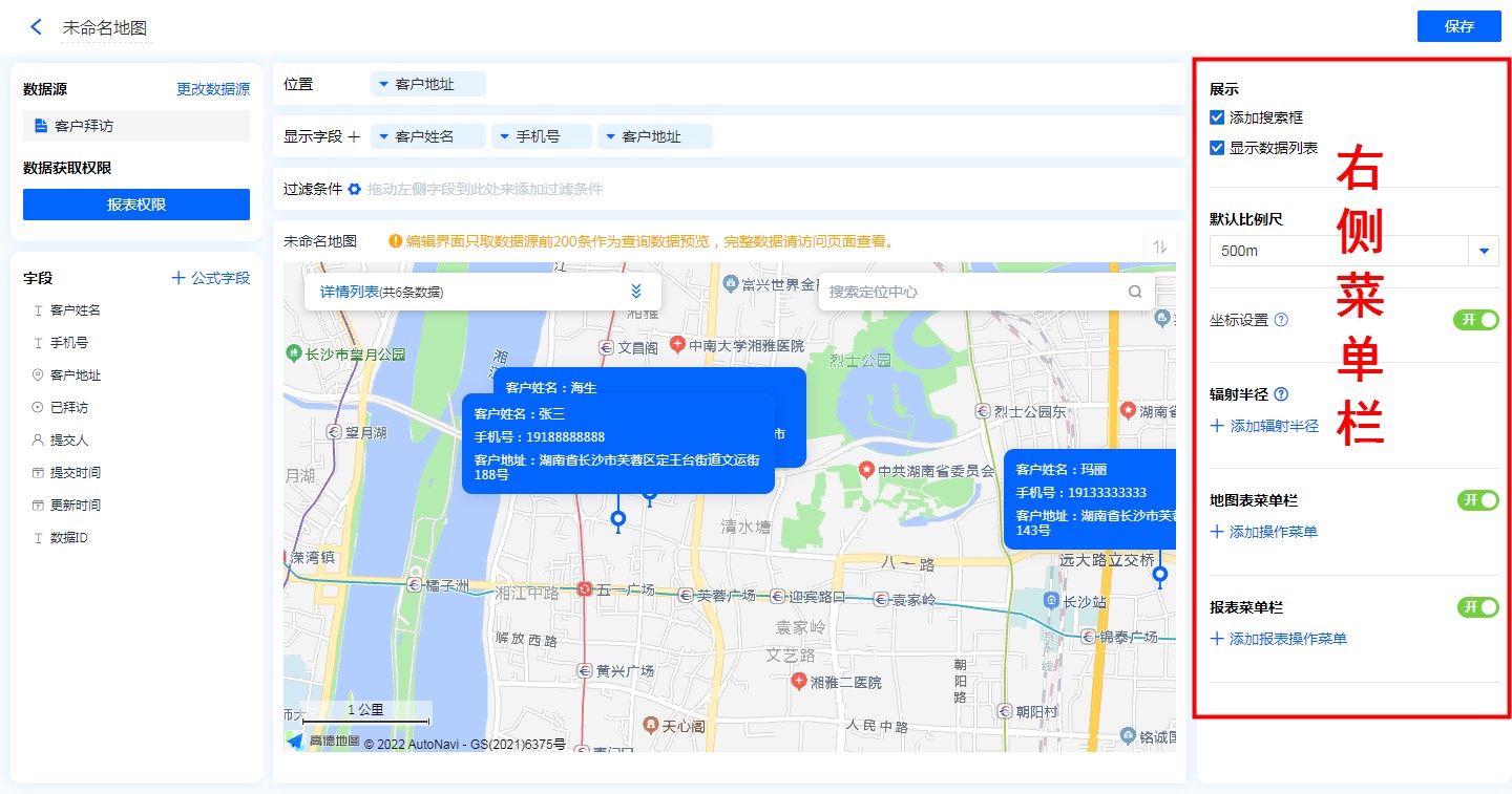 - 地图标识功能:显示字段勾选地图标识功能后,地图的位置标记处会显示该字段信息。
