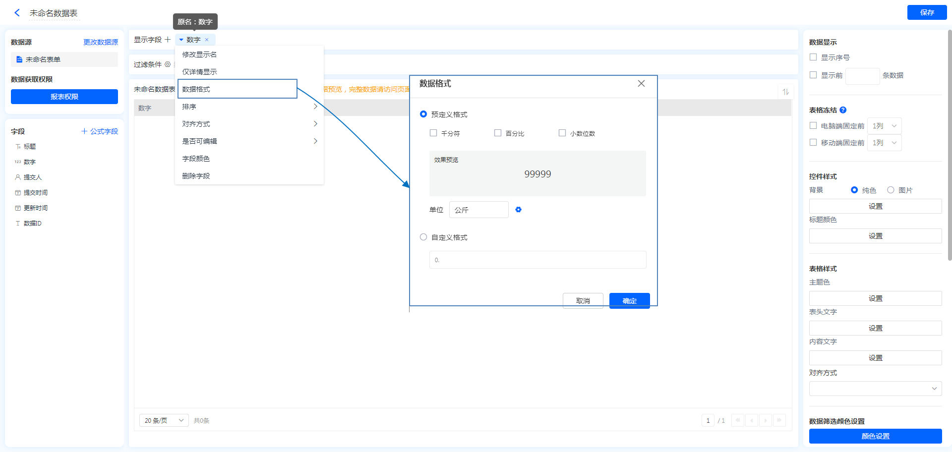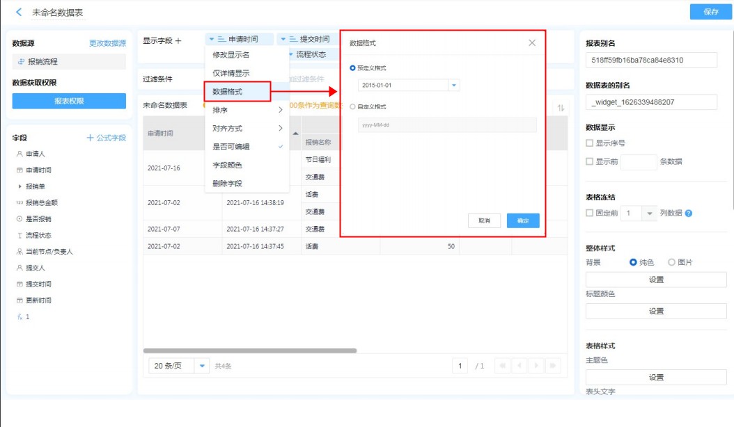 地址字段,日期字段,数字字段的格式设置很简单,只需要在报表中编辑字段,选择自己需要的格式即可。